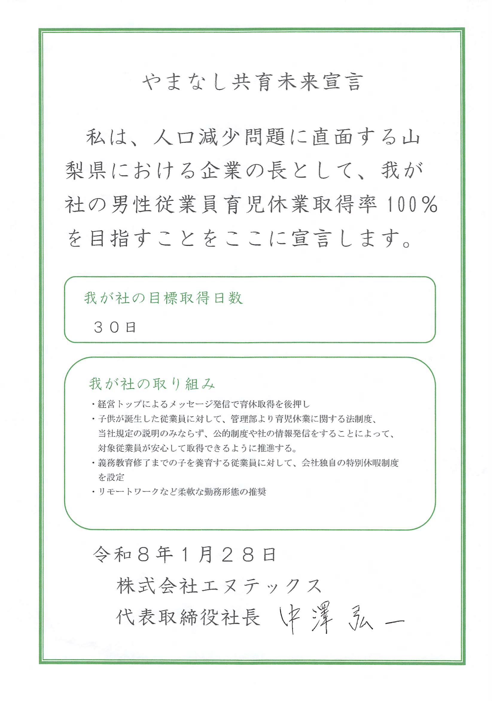 この度、当社は「やまなし共育(ともいく)未来宣言」の宣言を行うと共に、1月28日(水)に開催された宣言式に当社代表取締役の中澤が出席、宣言書の読み上げをいたしました。
