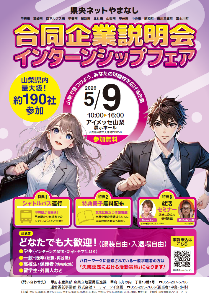 約190社の県内企業が参加する「合同企業説明会」に、当社も参加いたします。