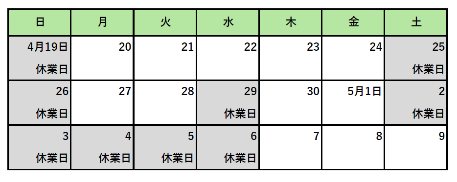 誠に勝手ながら、当社では下記の期間を GW休業 とさせていただきます。ご繁忙の折り、ご迷惑をお掛け致しますが何卒よろしくお願い申し上げます。